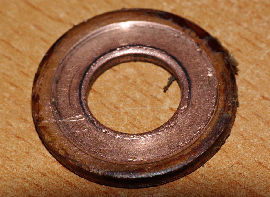 Tak už jsem přišel na to kudy nám ten olej teče, ten na straně u svíček jak zasírá celej motor a kape na koleno výfuku. Ty dva šrouby, jak drží hlavu na válci, jak jsou pod nima ty měděný podložky, tak koukejte jak ta podložka vypadá, je vymačkaná. Nechal jsem si vyrobit nový podložky, vyžíhal jsem je a už to ani nekápne