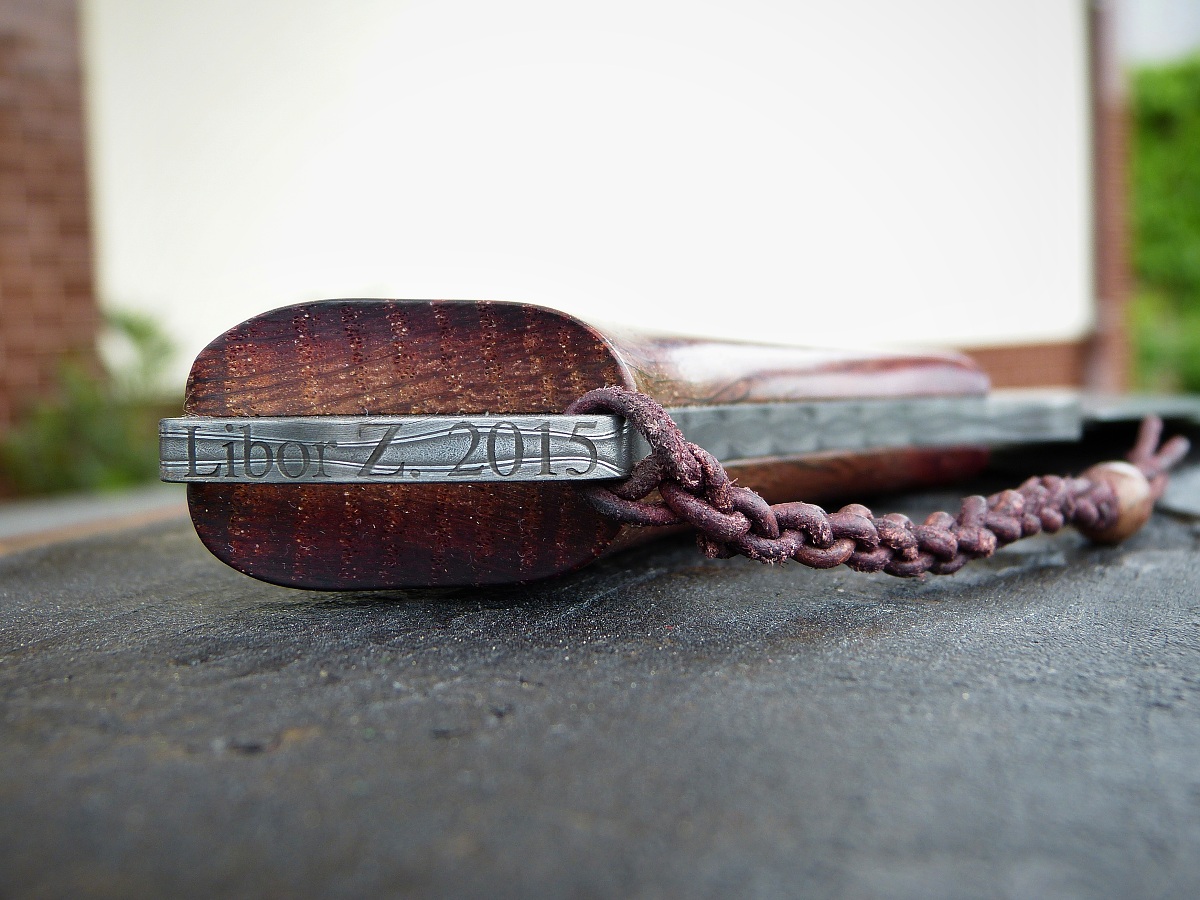 Nůž je krásnej, co ale nechápu je, jak může někdo na takovej krásnej kus ruční práce nechat vygravírovat nápis tak odporným sterilním počítačovým písmem... To někdo kdo umí vykovat nůž neumí udělat nápis? Nebo to tam nechal udělat někdo, kdo ti ho daroval?