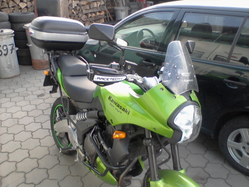 Čas plynul a mňa prestávalo baviť sedieť stále "vzadu",plus som prichádzal o dlhšie výjazdy a vláčil často krát inak neposedného pána"G". Minulú sezónu som si dal odstániť dioptrickú chybu zraku ktorá znižovala komfort nosenia helmy a tak už nič nebránilo túto sezónu začať zháňať stroj pre mňa,prvé čo som riešil bolo presvedčenie rodičov že sa chystám voziť a nie zabiť,ako to býva zvykom pri "jogurtoch". Podrailo sa a tak som začal zháňať stroj,mal som už vybraté a voľba palda na Kawasaki Versys. Po nejakom čase sa naskytla vhodná kúpa zánovného stroja u susedov v čechách a tak som neváhal a stroj už stoji doma,a robím na ňom kozmetické chyby a úpravy. Pridavávam aj jednu foto v ďeň dovozu.