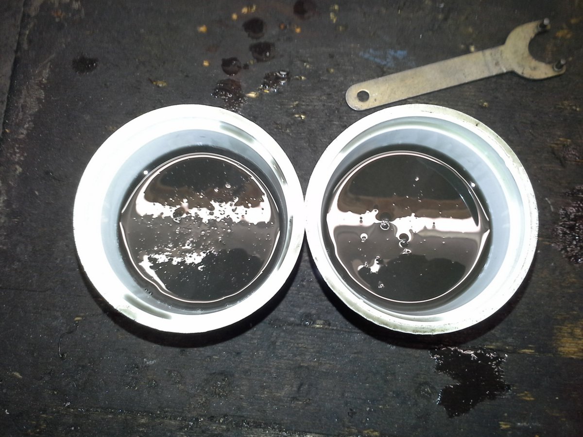 Přední tlumiče hotové, olej MOGUL Silence 15, 2x po 650ml.. Simerinky původní, byly bez úniku a olej, co jsem vypustil, byl sice notně opotřebený, ale bez cucků nebo jakéhokoliv bordelu.. Trochou toho oleje (cca 250ml) jsem po vypuštění tlumiče nejdřív propláchl a ten už jsem vylil skoro čistý.. Původního oleje jsem vypustil cca 1100ml, takže v každé vidli chyběla zhruba decka.. Tákže hotovo..Rimmerak píše:Ahoj pane elektrotechniku![]()