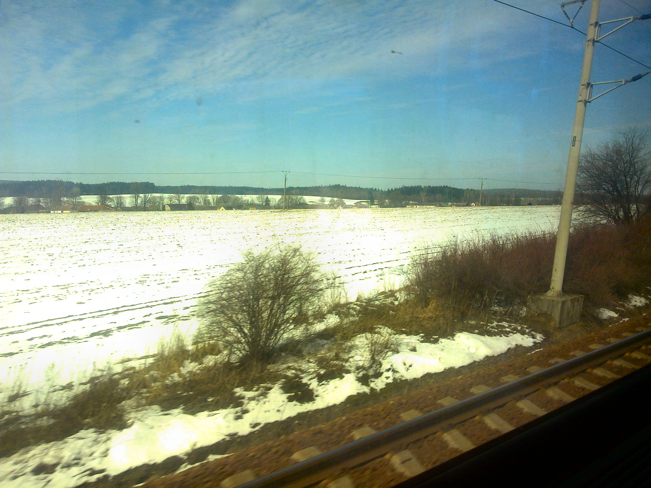No sednu na vlak a v podstatě šlo všechno hladce, cca 4x jsem přestupoval, někde jsem čekal dlouho někde zase krátce, žádný vlak neměl zpoždění. Jel jsem i tím moderním rychlíkem, což bylo supr a pro člověka co vlakem nejezdí parádní zážitek, byl to fakt fofr. Cestou jsem se kochal okolím přičemž ostatní spali, opravdu nešlo ani cítit že jedeme:) Bylo super pozorovat jak se krajina absolutně holá a rovná, mění na zasněženou a hornatou víc a víc směrem na sever, ale ne tak super když jsem si uvědomil že zpátky bych možná mohl jet na motorce:)).. Ale nijak mě to netrápilo, den předem jsem se opravdu dobře vybavil a měl jsem 2 batohy oblečení na moto.
