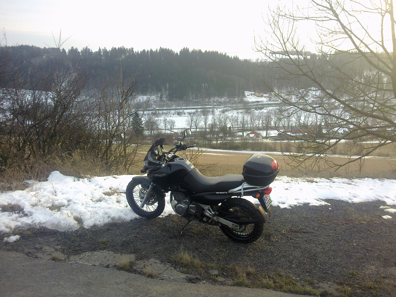 Po delším výpočtu trasy jsem udiveně zjistil, že jsem krásnými klikatými cestami lesem, i vedlejšími rozbitými a prostě kam mě motorka táhla, jel správně, tak jsem ji pochválil a pokračoval v cestě, tentokrát již naveden navigací:) Po cestě jsem si párkrát zastavil a udělal několik fotek z radosti z nové motoroky: