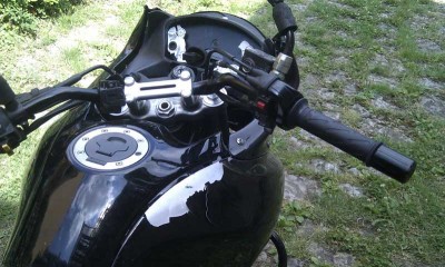 Prasklý pravý plast kolem nádrže a oba ty horní plasty.