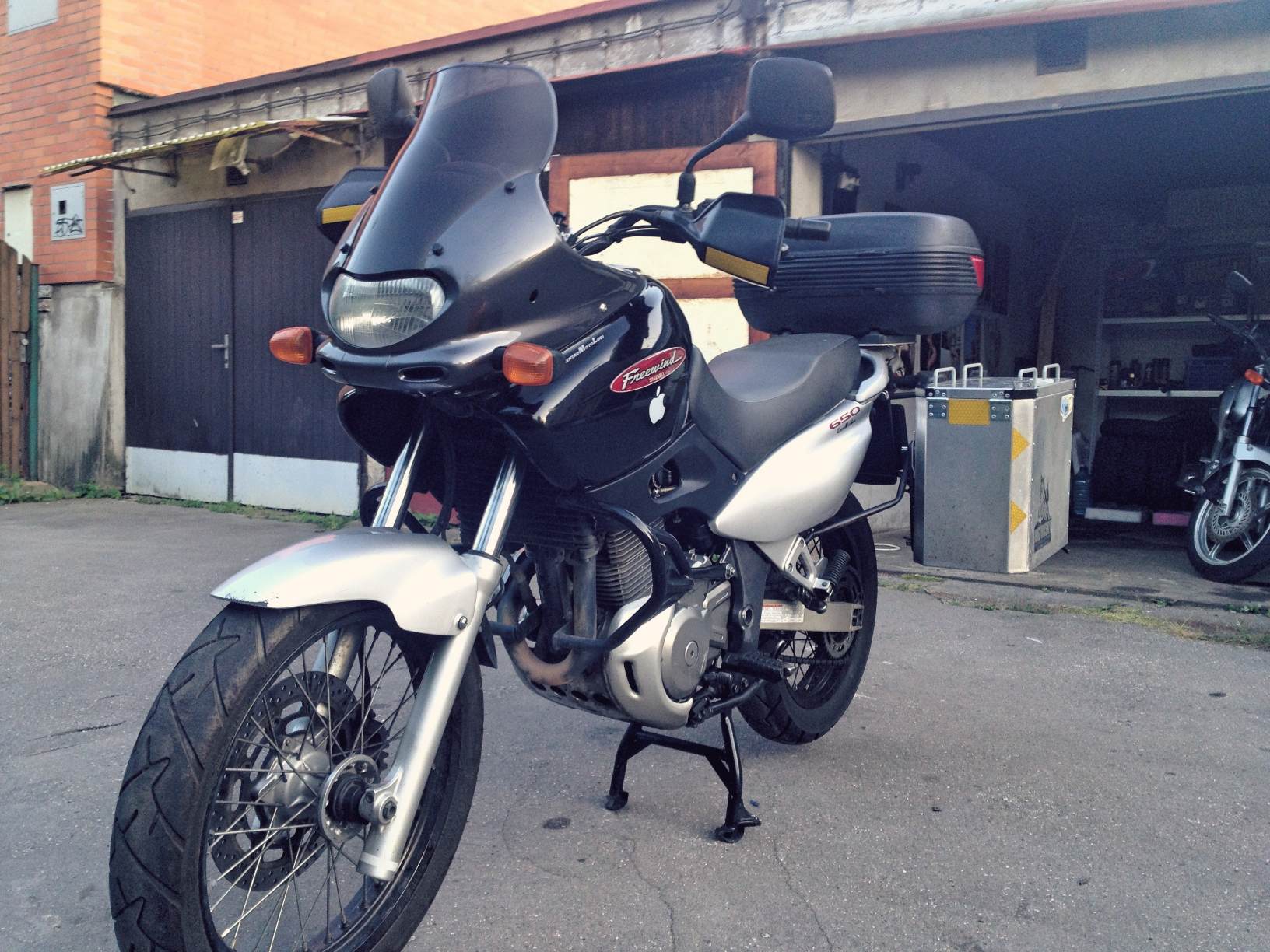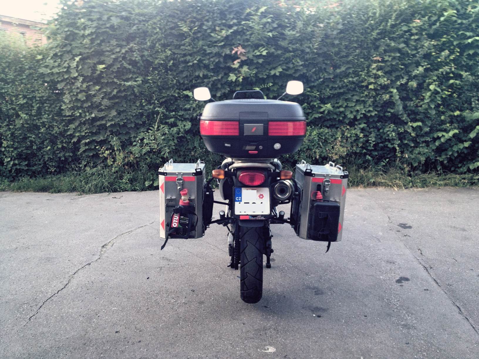 mnou pridane doplnky: padaci ramy, vysoke plexi, zasuvka 12V, topcase, bocni kufry + nosice (samovyroba), kotrolka oleje, drzak telefonu, tankvak